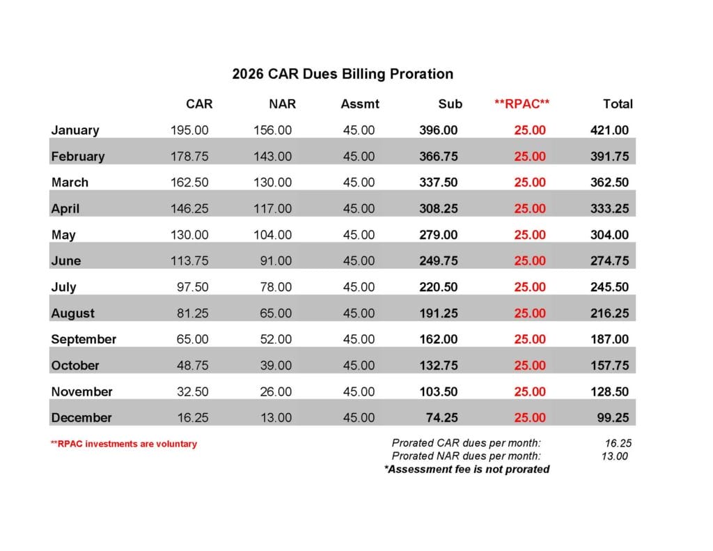 2026 Dues Proration Chart